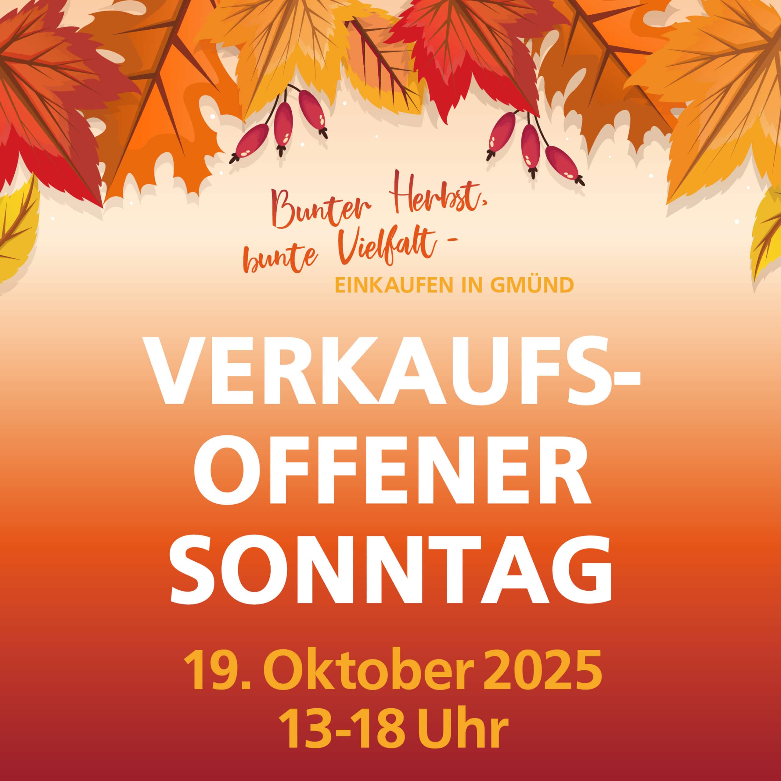 Der Herbst zeigt sich in Gmünd von seiner schönsten Seite! Unter dem Motto „Bunter Herbst – bunte Vielfalt einkaufen in Gmünd“ laden wir Sie herzlich zum verkaufsoffenen Sonntag am 19. Oktober 2025 ein.